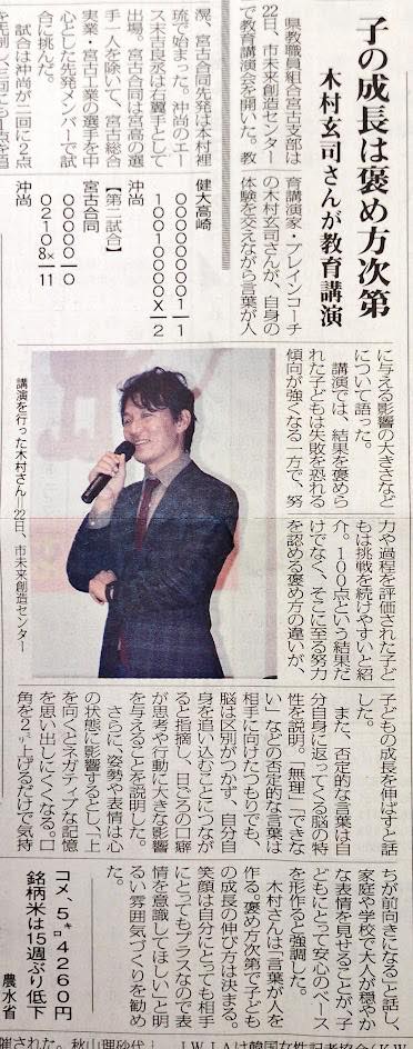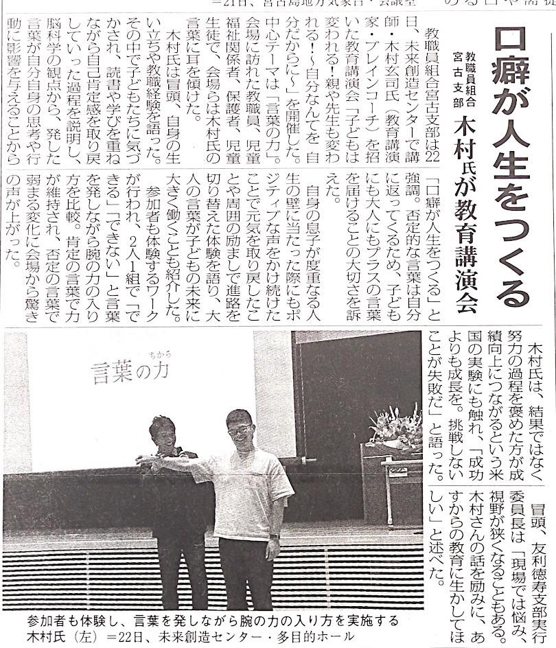 先日の沖縄県宮古島での講演の様子を地元紙にて記事にしていただいたそうです!