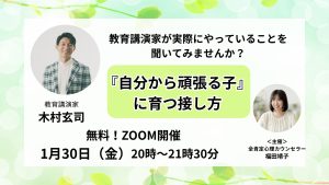 【1/30(金)福田靖子さん主催 『”自分から頑張る子”に育つ接し方 〜教育講演家が実際にやっていることを聞いてみませんか?〜』】